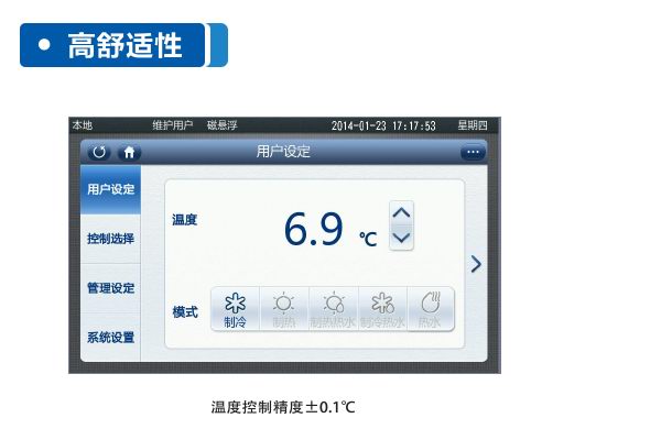 采用磁懸浮變頻壓縮機(jī),機(jī)組可實(shí)現(xiàn)2%100%負(fù)荷連續(xù)智能調(diào)節(jié),出水溫度控制精度±0.1℃,溫度波動(dòng)小,舒適性高。