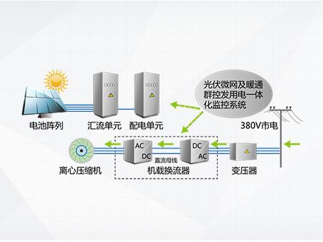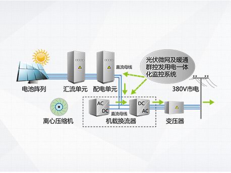 光伏發(fā)電系統(tǒng)不發(fā)電,主機向電網取電運行,機組相當于常規(guī)高效變頻離心機。 |